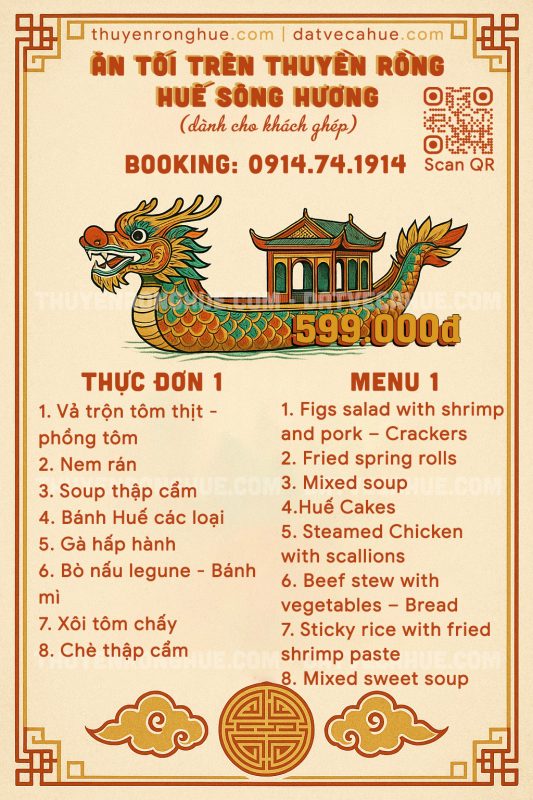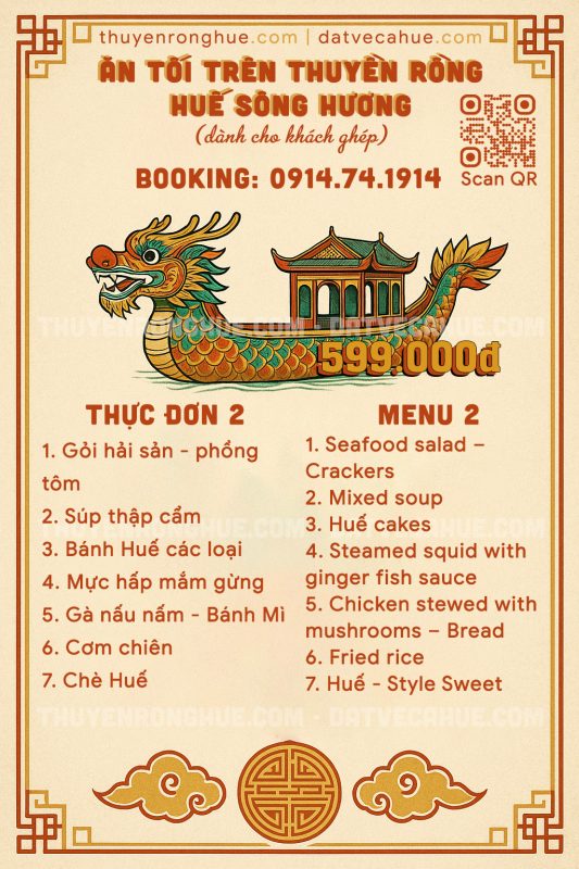 Thực đơn ăn tối trên thuyền rồng Huế (ghép khách)